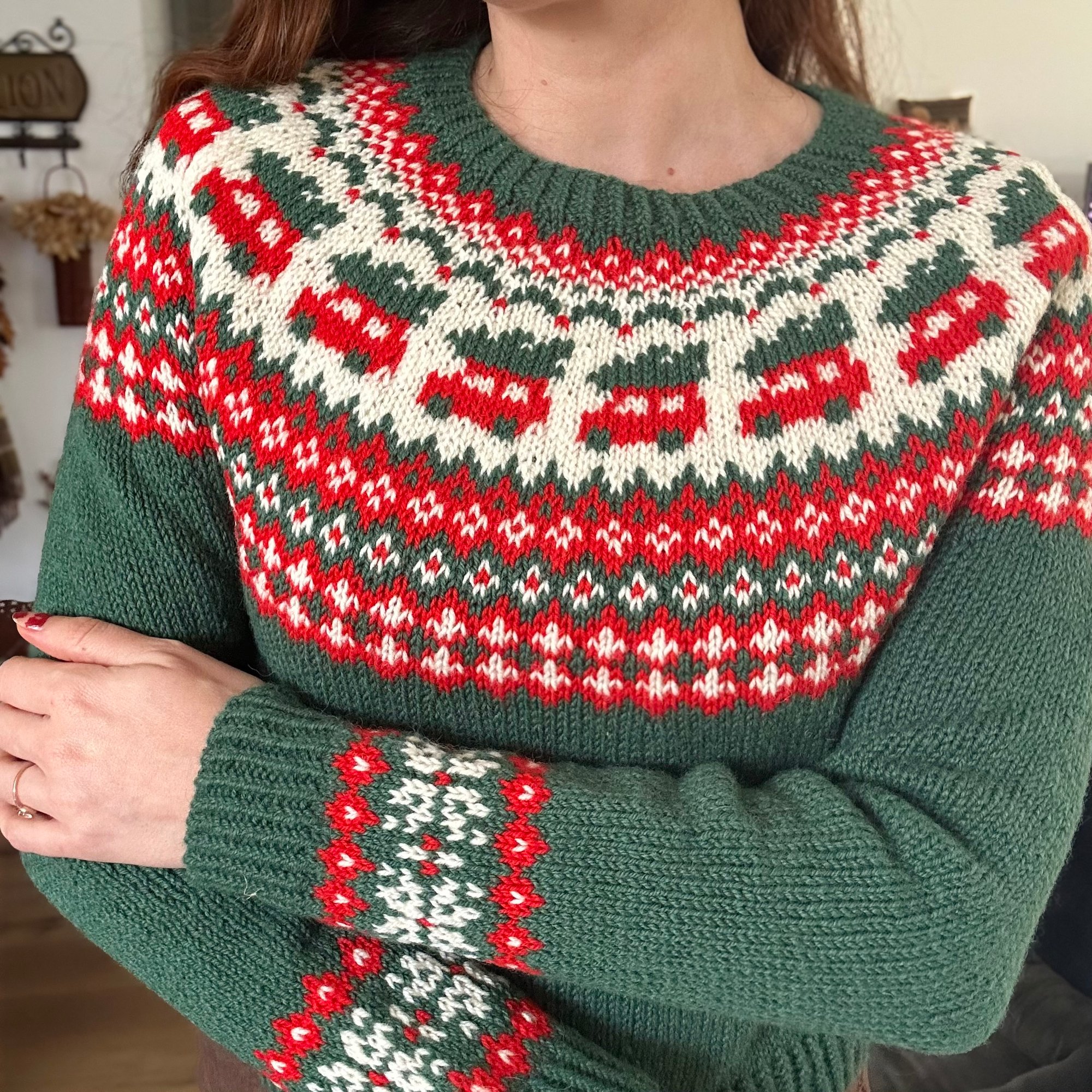 Le yoke démarre après l’encolure et descend jusqu’aux emmanchures, avec un rappel de jacquard au bas des manches. Tricoté de haut en bas, en rond et sans couture, il s’essaie facilement en cours de route pour ajuster la longueur du corps et des manches. Une option de rangs raccourcis après le yoke améliore le tombé.
