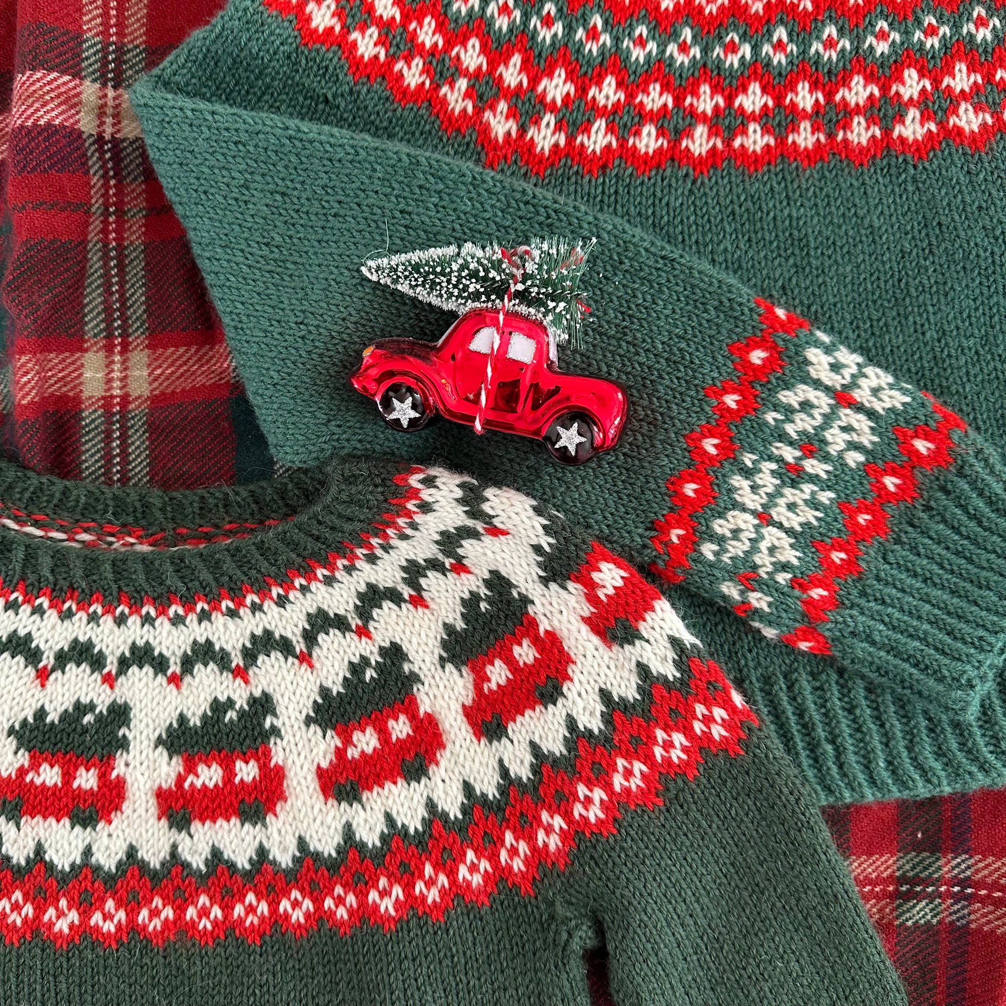 Un joli motif de sapin de Noël sur une voiture rétro qui évoque le retour à la maison, les rires au coin du feu et la douce nostalgie des traditions hivernales.