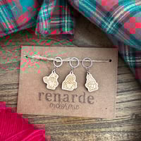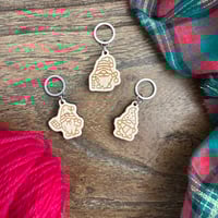 Ce lot comprend 3 marqueurs en bois de gnomes. Ils sont montés sur des anneaux argentés en acier inoxydable adaptés à des aguilles de tricot allant jusqu'à 8 mm/US 11.