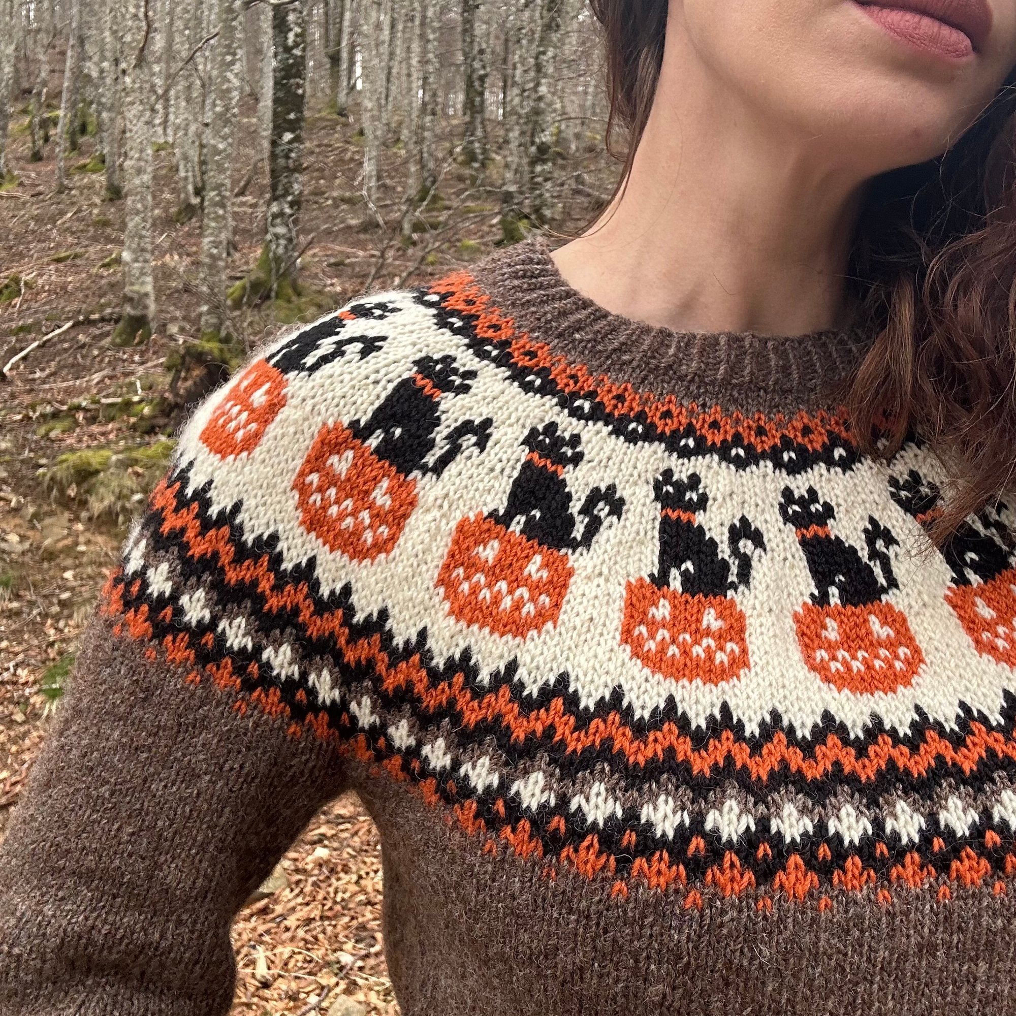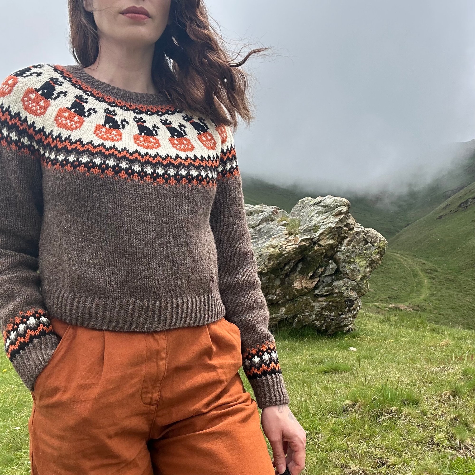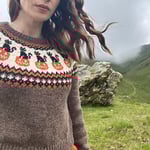 Le yoke démarre après l’encolure et descend jusqu’aux emmanchures, avec un rappel de jacquard au bas des manches. Tricoté de haut en bas, en rond et sans couture, il s’essaie facilement en cours de route pour ajuster la longueur du corps et des manches. Une option de rangs raccourcis après le yoke améliore le tombé, et vous pouvez choisir entre manches cintrées ou droites.