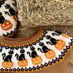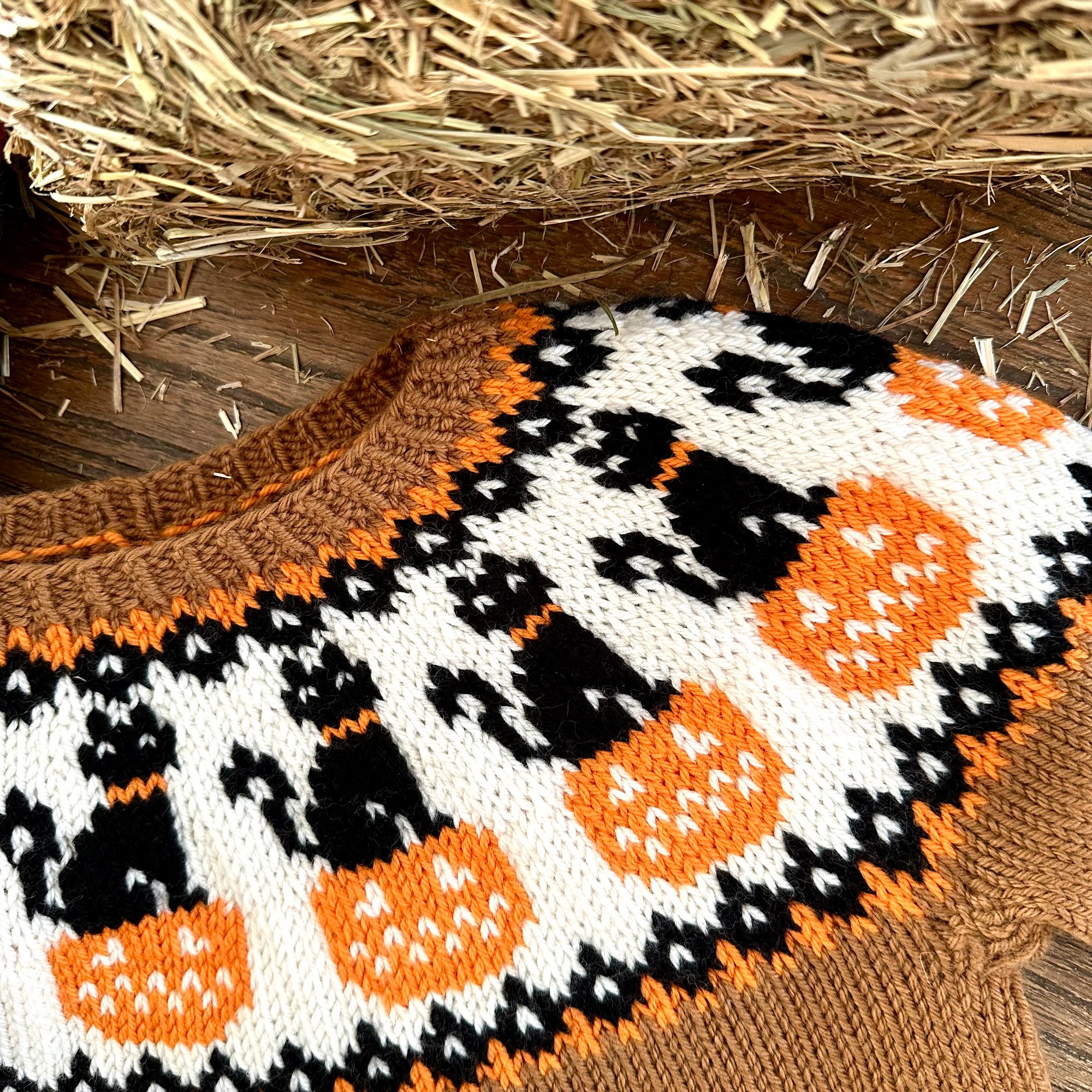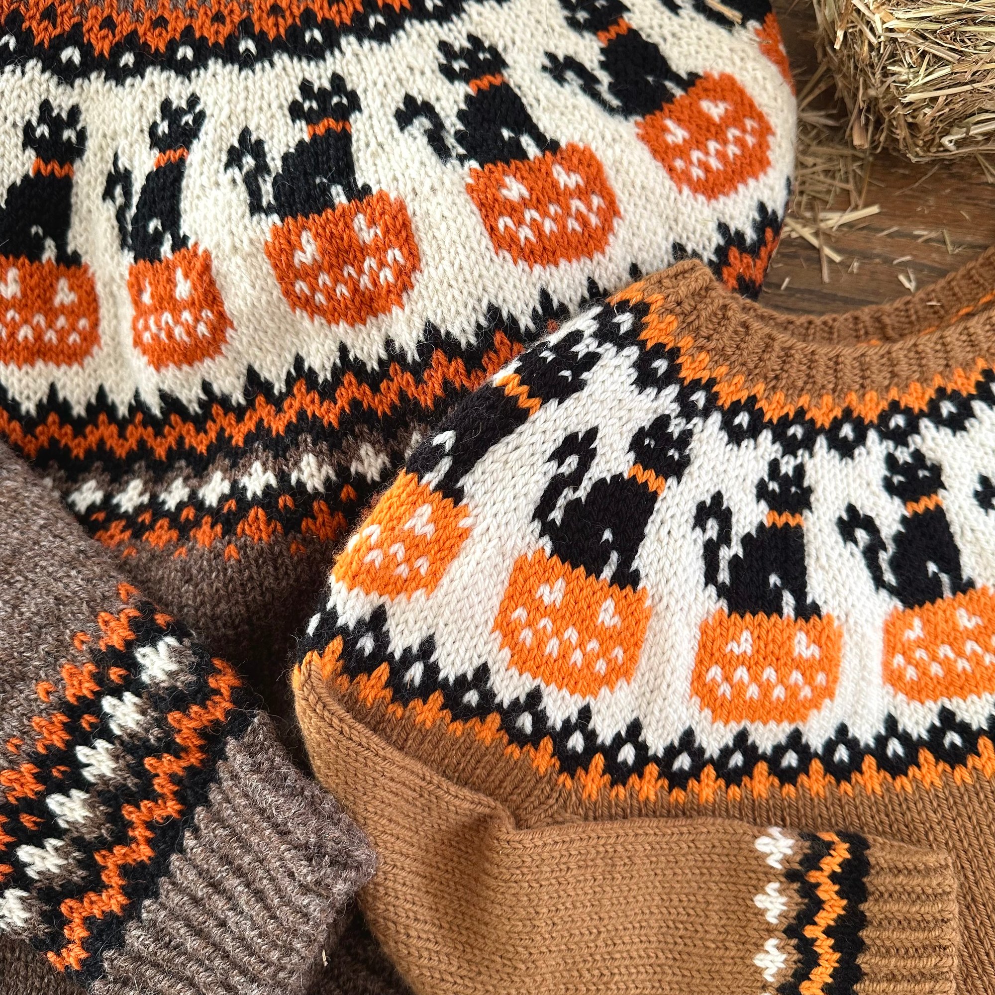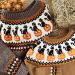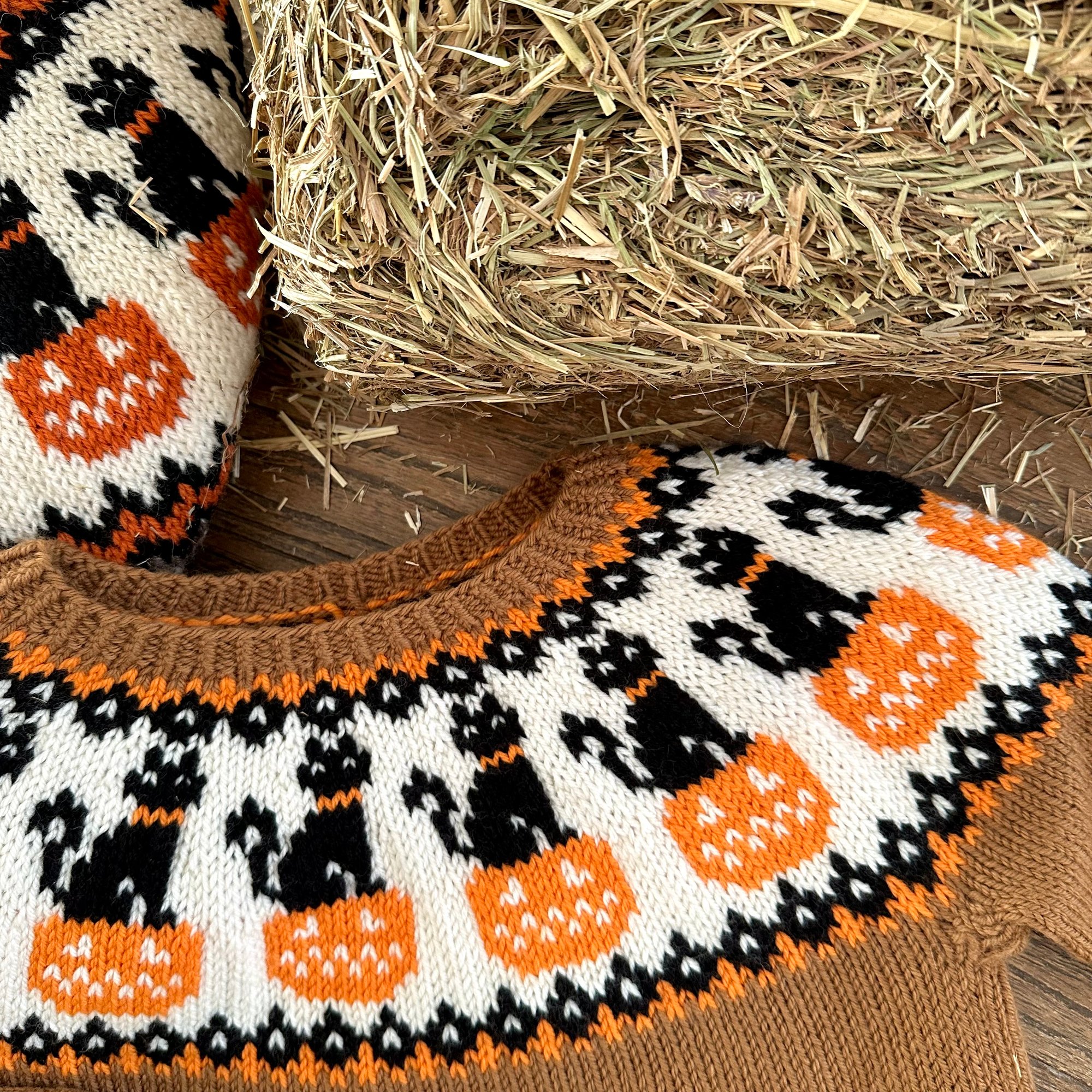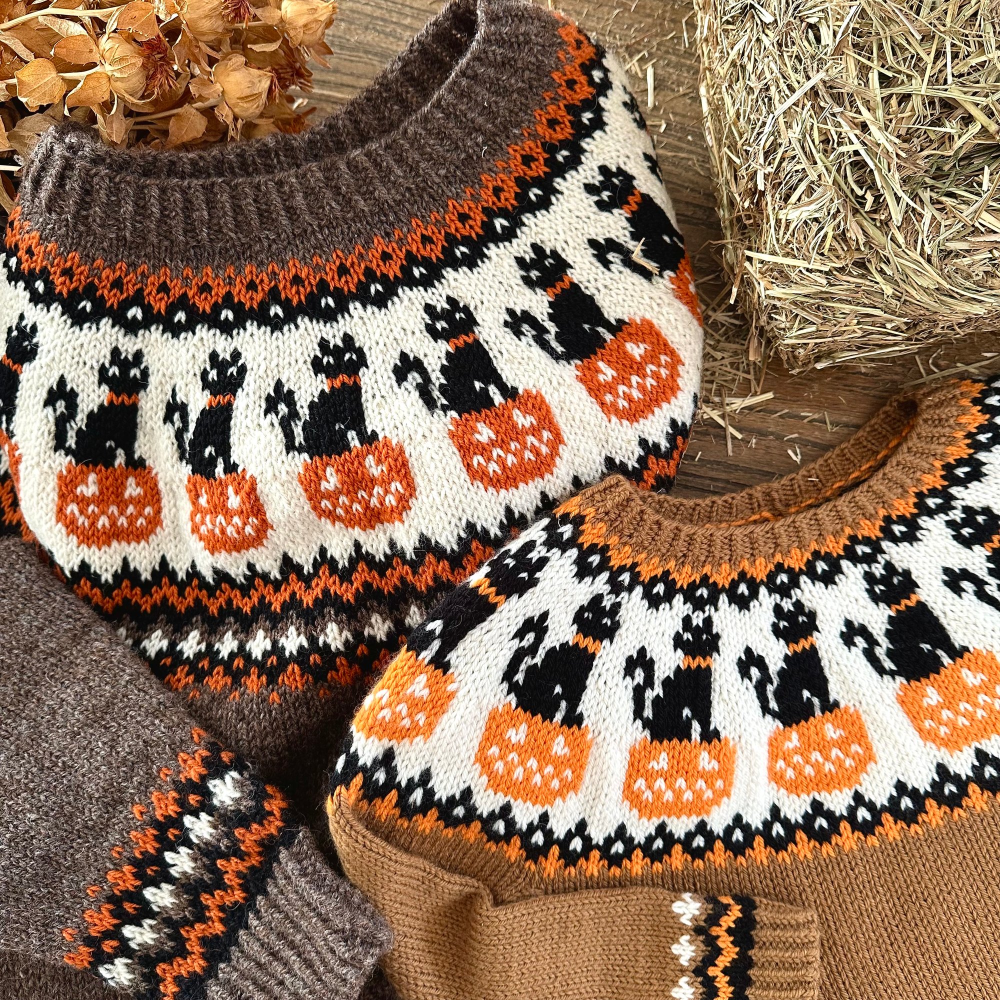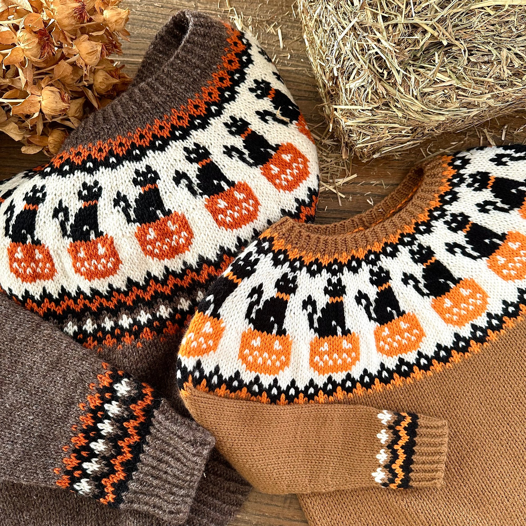 Célébrez l’automne et l’esprit d’Halloween avec ce pull jacquard aux motifs de chats noirs et de citrouilles.