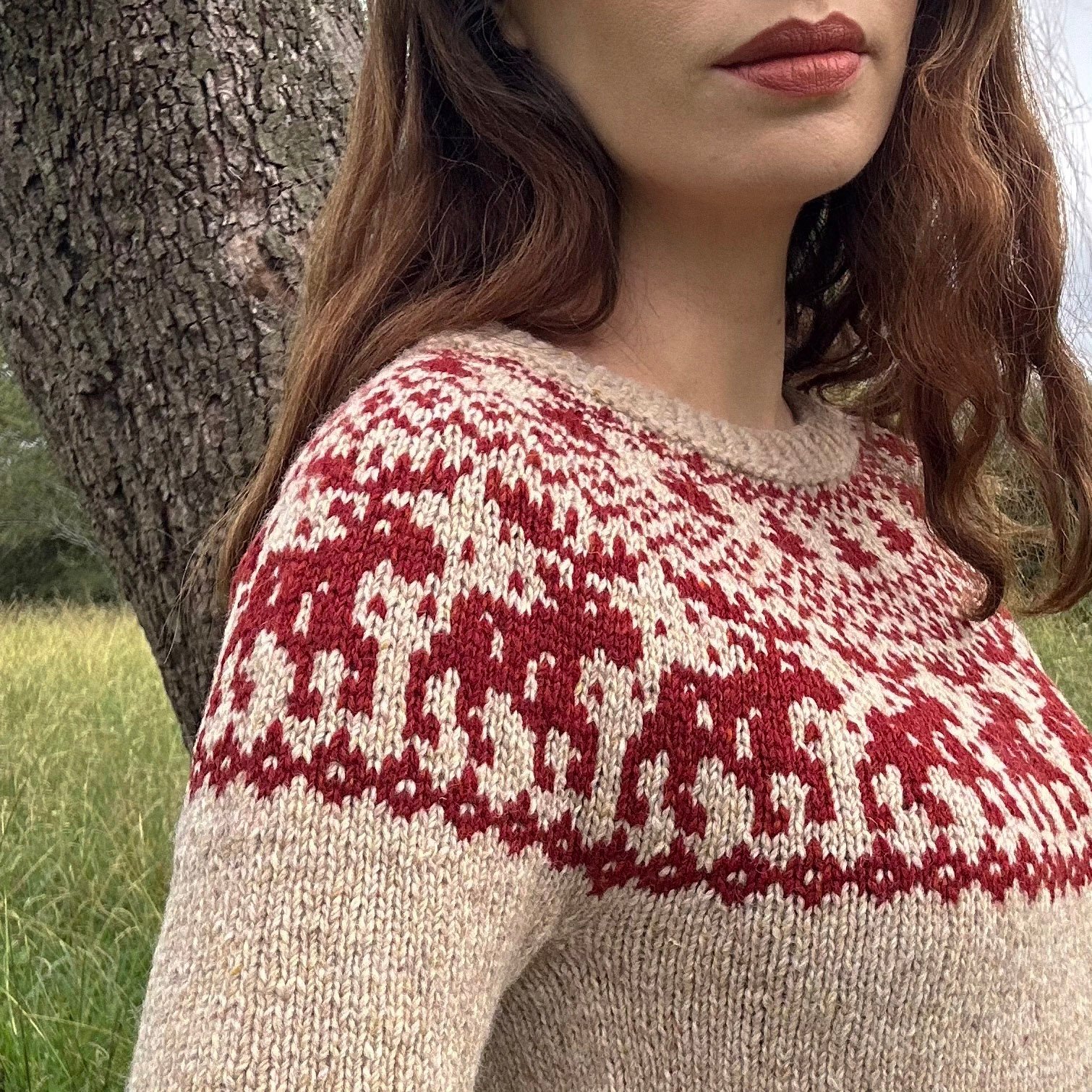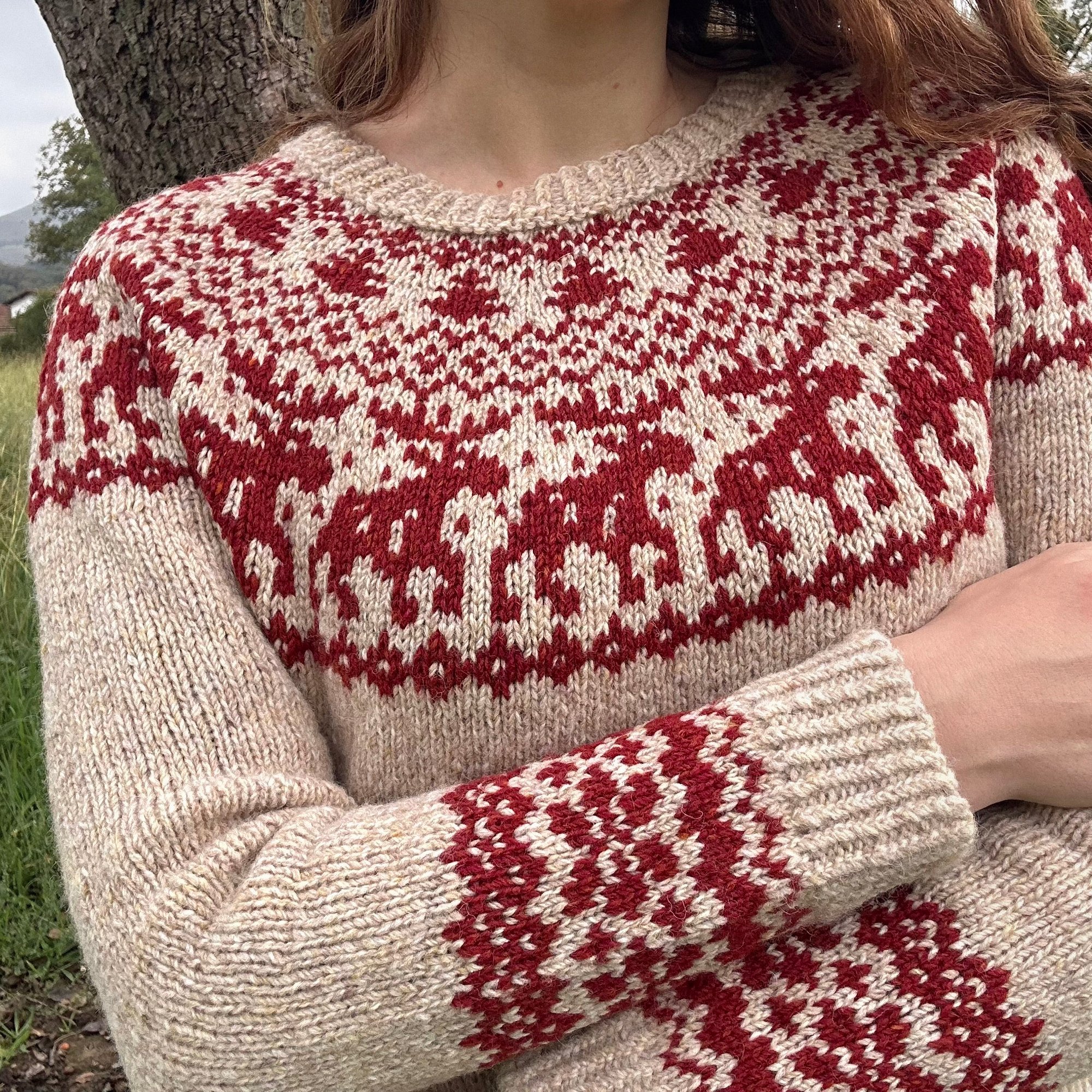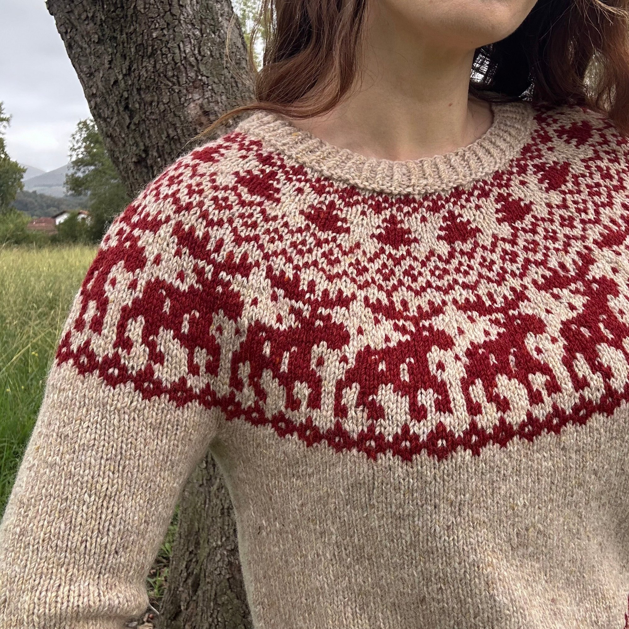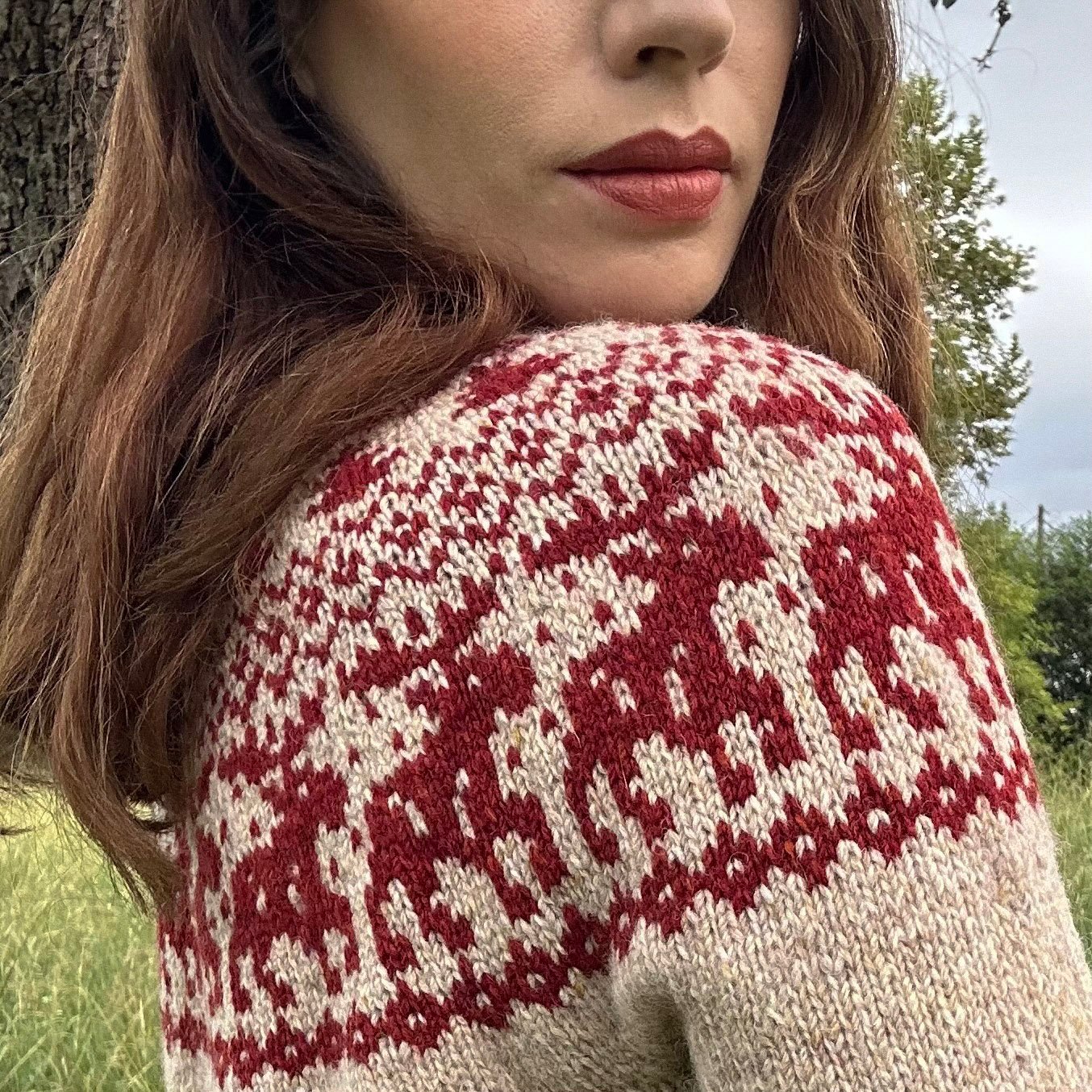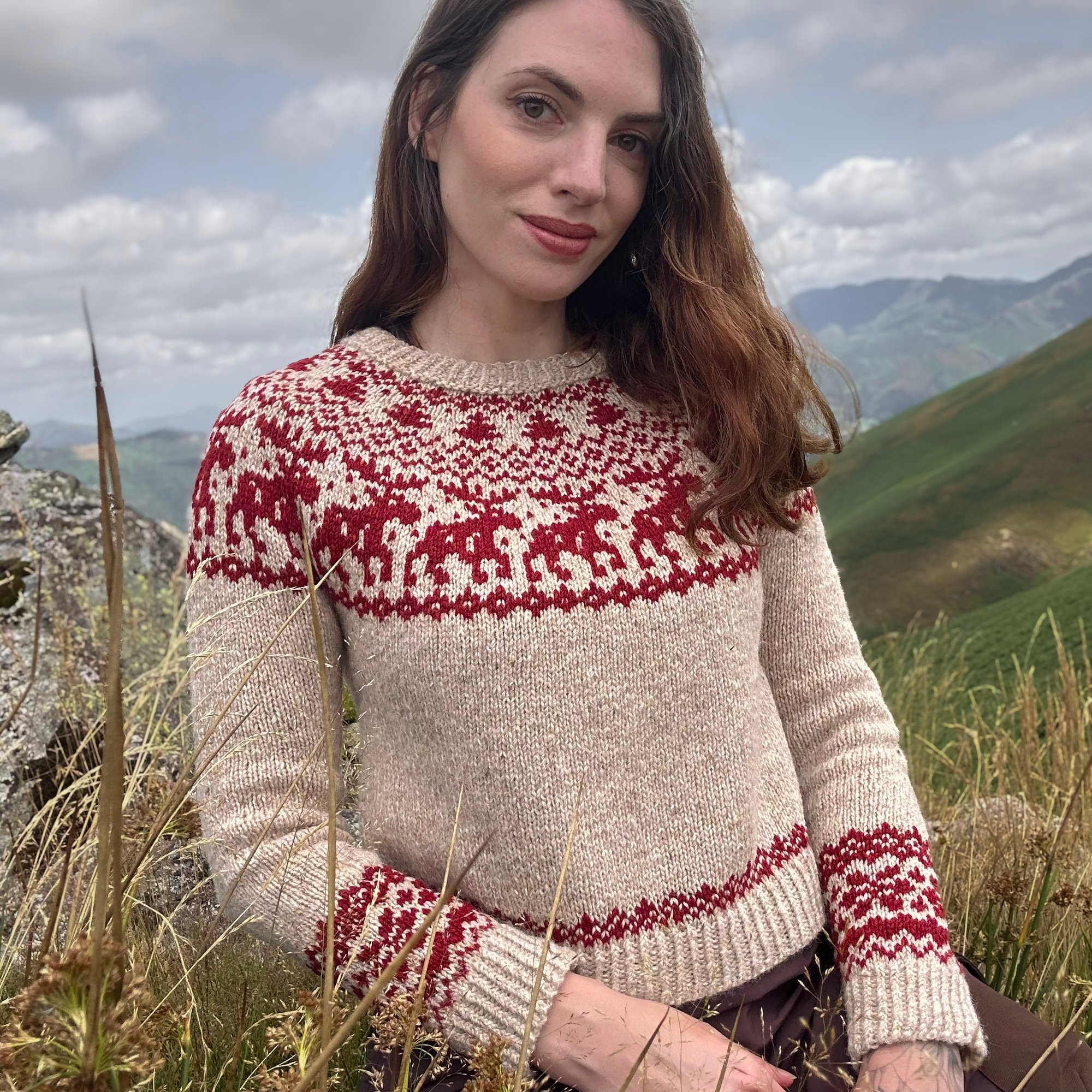 Le yoke démarre après l’encolure et descend jusqu’aux emmanchures, avec un rappel de jacquard au bas des manches. Tricoté de haut en bas, en rond et sans couture, il s’essaie facilement en cours de route pour ajuster la longueur du corps et des manches. Une option de rangs raccourcis après le yoke améliore le tombé.