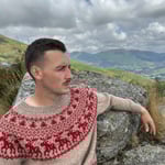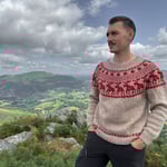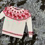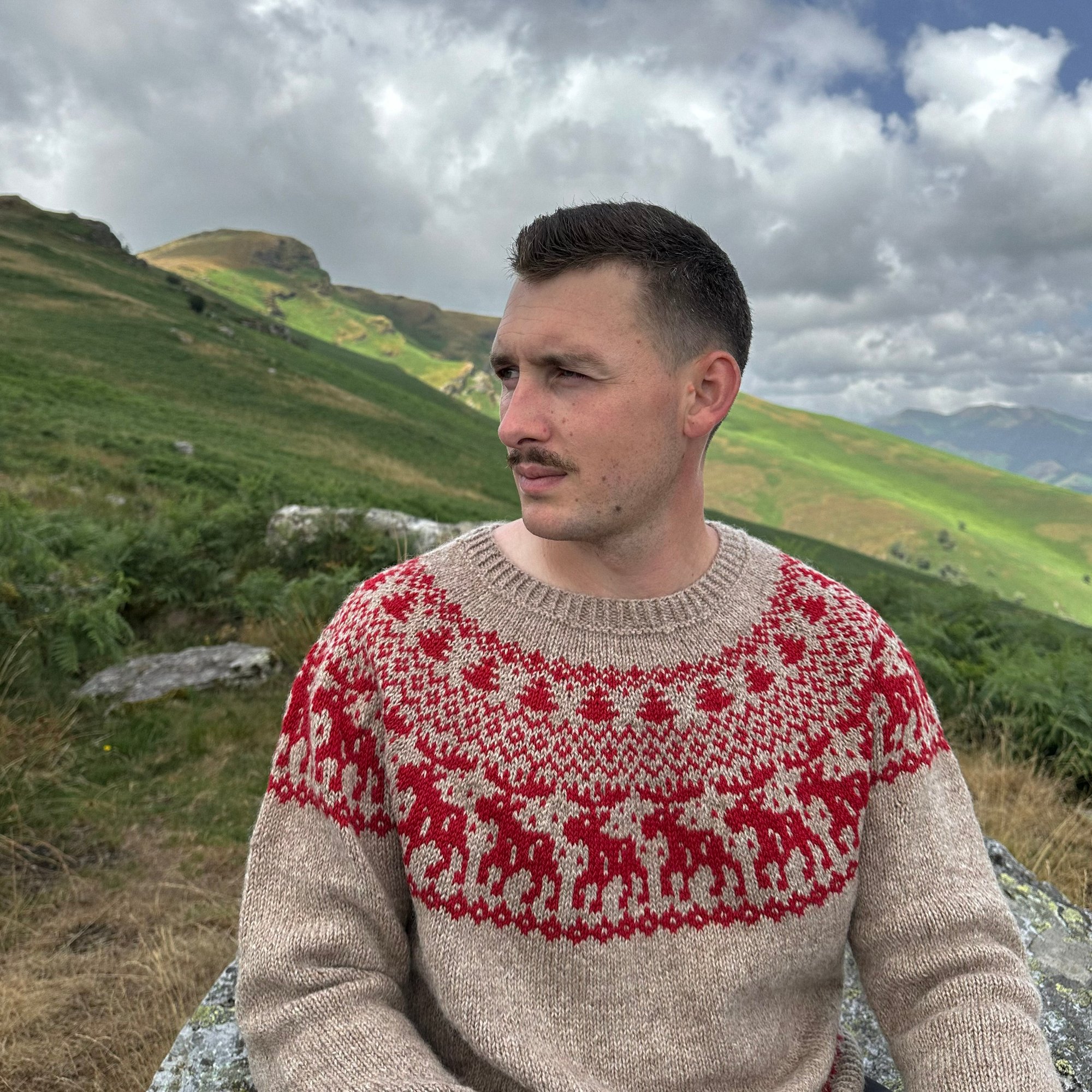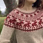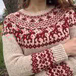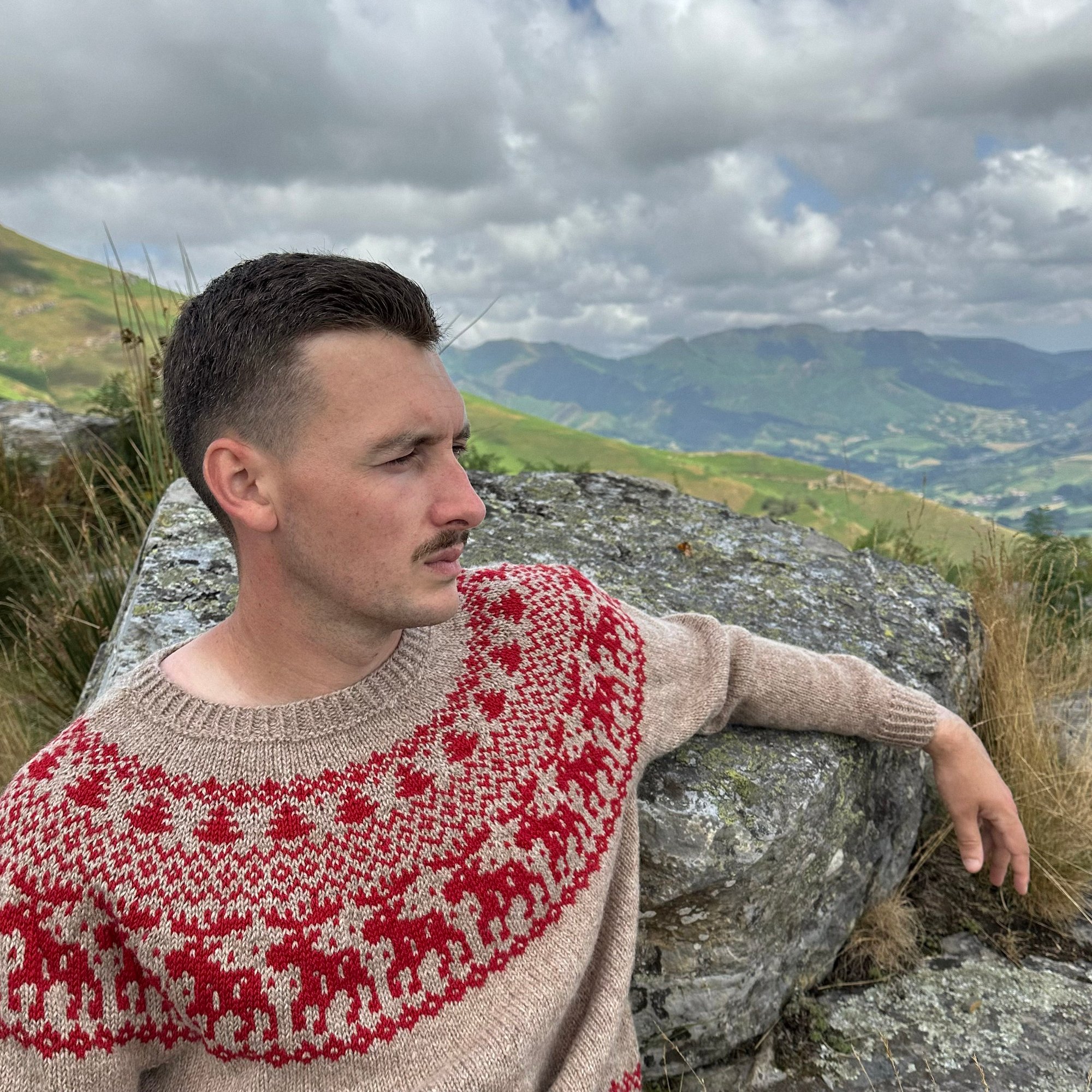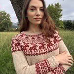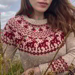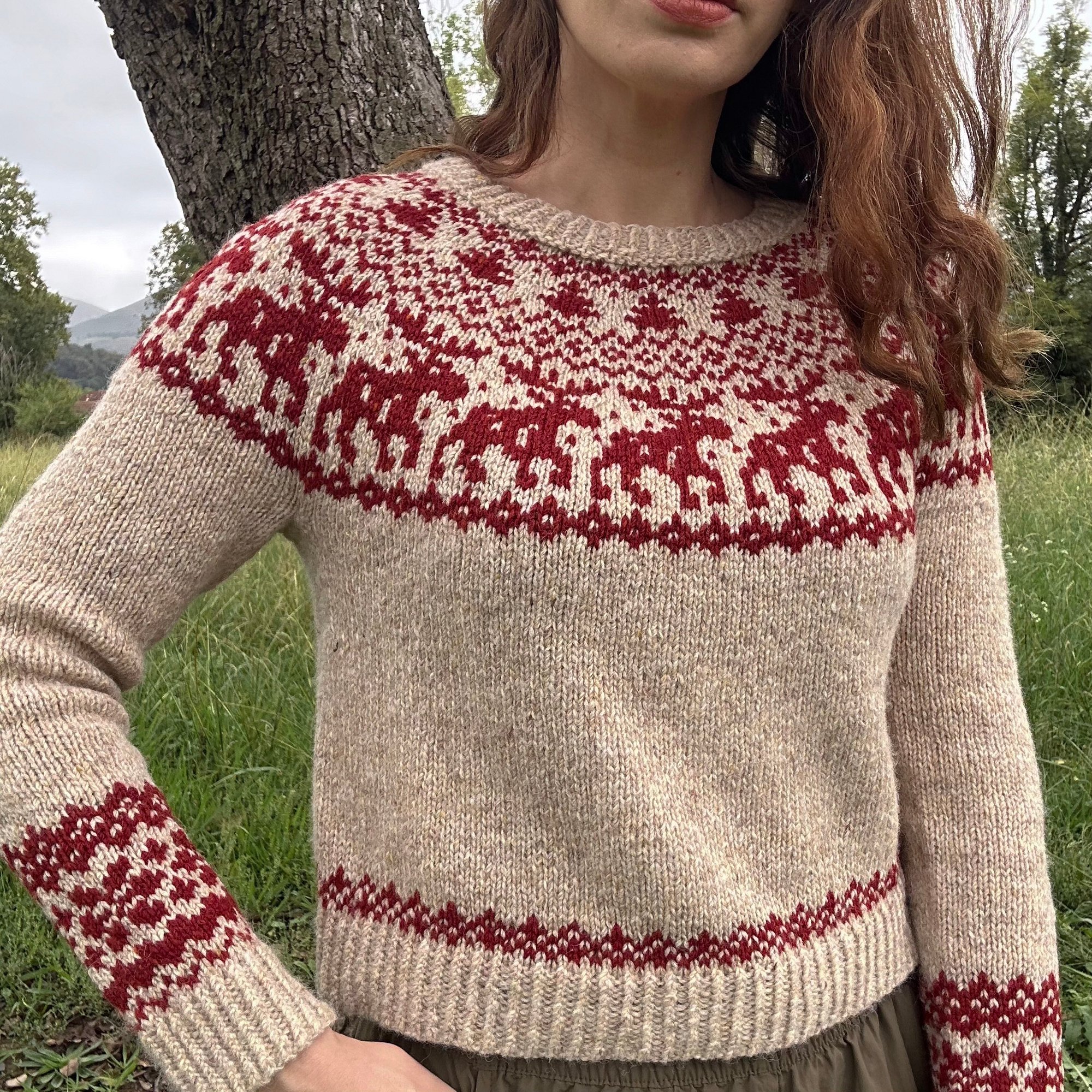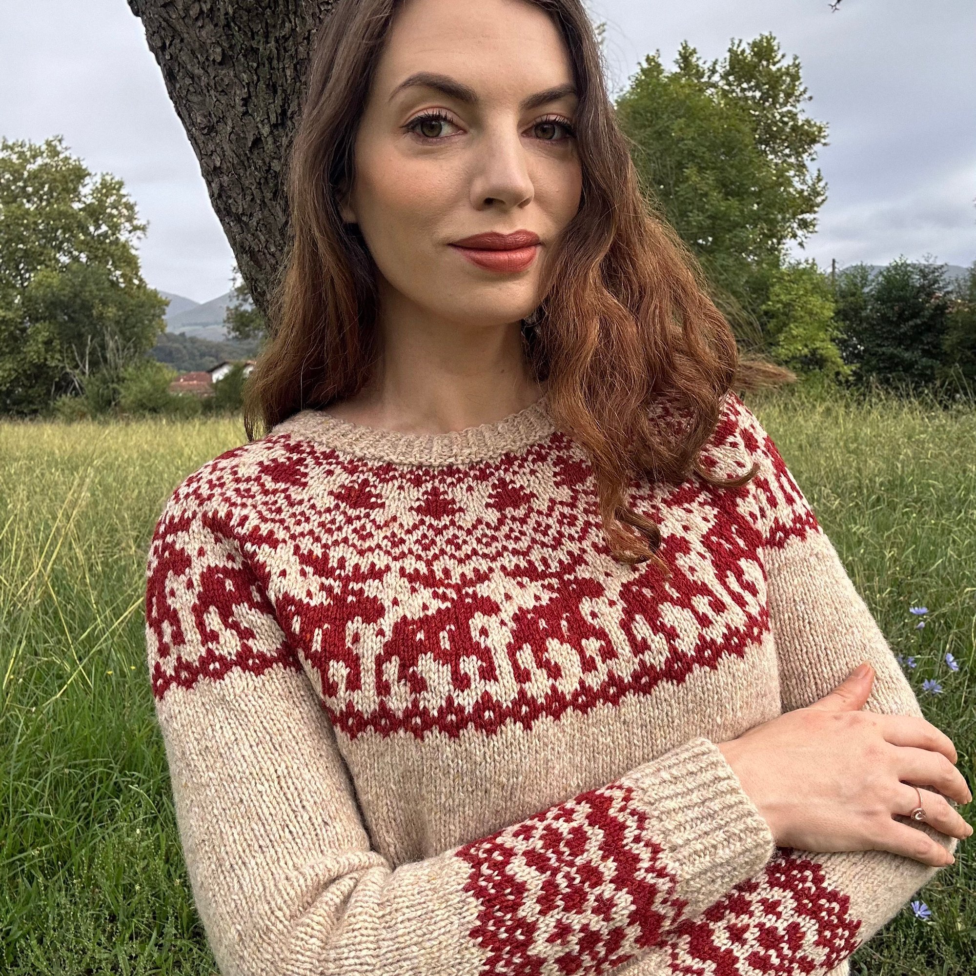 Le yoke démarre après l’encolure et descend jusqu’aux emmanchures, avec un rappel de jacquard au bas des manches. Tricoté de haut en bas, en rond et sans couture, il s’essaie facilement en cours de route pour ajuster la longueur du corps et des manches. Une option de rangs raccourcis après le yoke améliore le tombé.